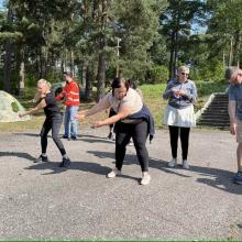 Vi passar på att repa utomhus- uppvärming i Folkets park i strålande sol.
