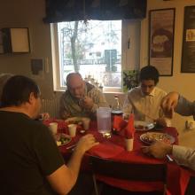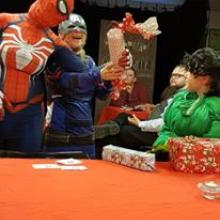 Så var terminen plötsligt till ända och det var dags att ta jullov. Vi bjöd in lite gästskådespelare och andra med anknytning till Änglarna för lite julmat, runt 35 personer blev vi. Trevligt att kunna äta och mötas innan det var dags att önska alla en God jul och ett gott nytt år. Tomten hade i år fått flunsan eller nåt annat smittsamt så han hade kallat in rejäl förstärkning av tre Superhjältar- Hulken, Spindelmannen och Captain America skötte julklappsbytet i år.