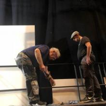 Christer Billström vår ljusdesiger är på plats med ljus från Västmanlands Teater. Kent Niklasson som tillsammans med Kim har byggt hela skeppet Charlotta har fixat bakstycken så skeppet ser högre ut och poppar ut mot den svarta fonden.