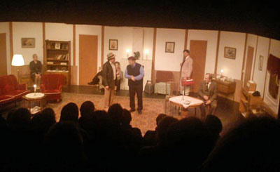 Agatha Christies berömda mordgåteteater där publiken i pausen får gissa vem av aktörerna som är mördaren.